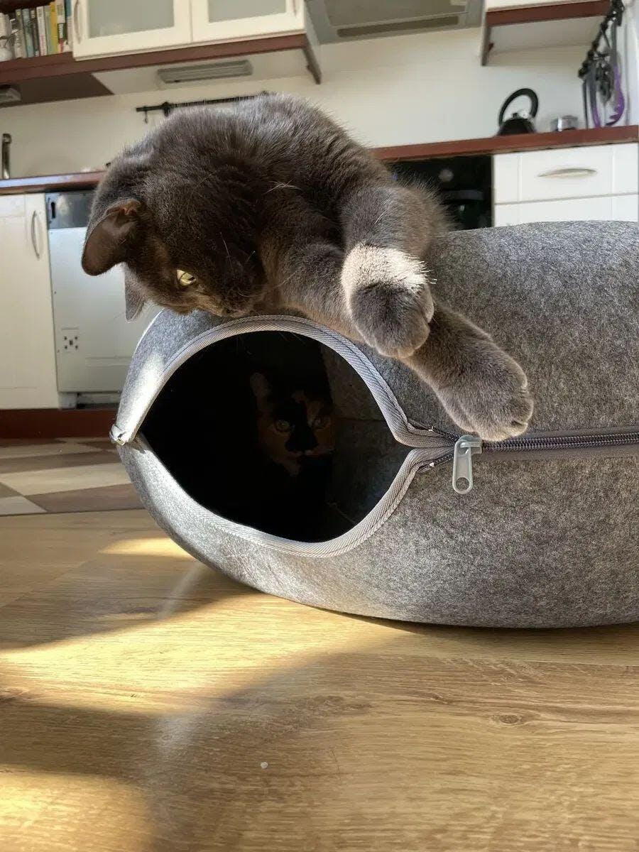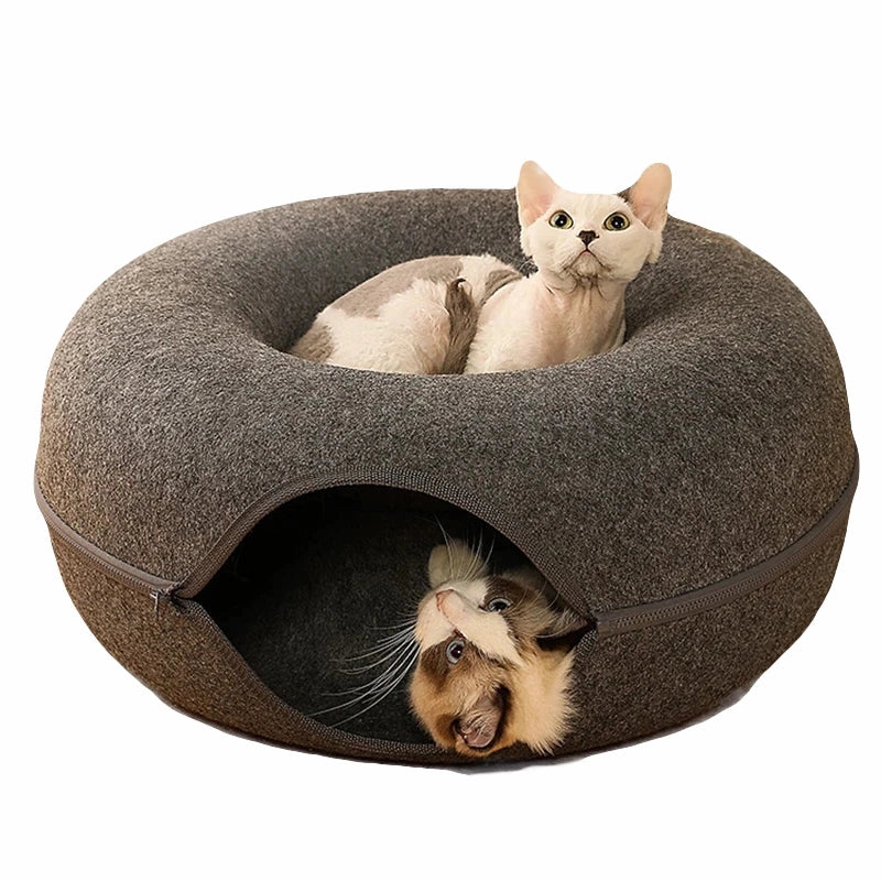 こちらは多機能なデザインが大きな特長です。快適な寝床と、猫ちゃんが夢中になる遊び場(トンネル)が一つになっています。さらに、耐久性に優れ、お手入れも簡単で長持ちするよう設計されています。スペースも有効活用でき、経済的です。