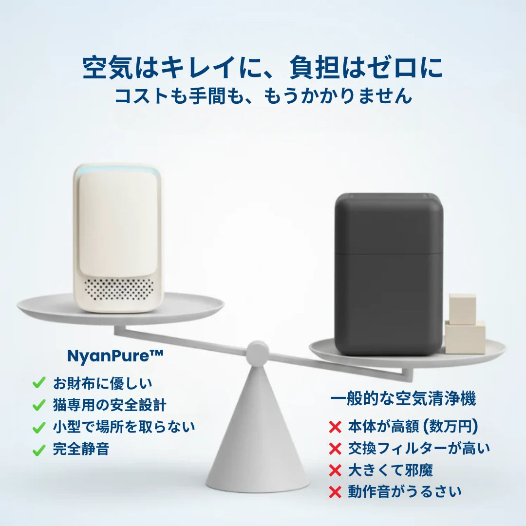 NyanPure™(ニャンピュア)は、ただの消臭機ではありません。猫と暮らす家庭専用に設計された、空気清浄ソリューションです。